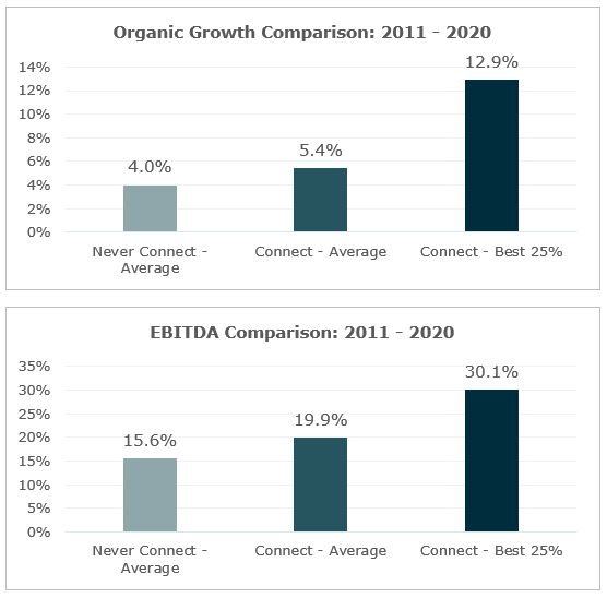 The cornerstone of any peer exchange should be financial benchmarking. In MarshBerry’s experience, firms that are part of the Connect Network, see firsthand just how significantly top tier firms financially outperform their rivals, usually by 200% – 300%. Critical financial metrics provide an objective way to measure the return of their peer exchange investment as well as a comparison of their performance compared to the rest of the insurance industry. For example, according to MarshBerry’s proprietary financial benchmarking system, Perspectives for High Performance (PHP), the Best 25% of MarshBerry’s Connect Network members have an organic growth rate of 12.9%. This is over three times more than firms that never join a peer exchange. In addition, Connect Network members have an average EBITDA of 30.1% compared to only 15.6% for firms that never joined the Connect Network. These are only two examples of quantitative outcomes that demonstrate how peer exchange participation can be more powerful than tackling change and growth alone.