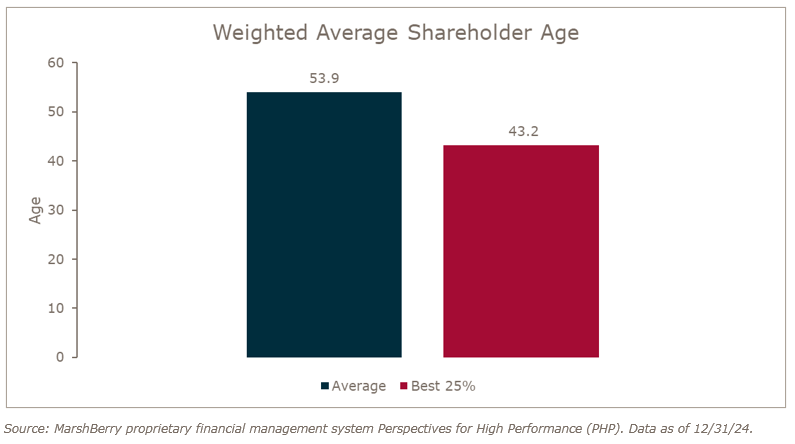 Start by looking at the firm’s Weighted Average Shareholder Age (WASA). This metric shows the average of the shareholders’ age weighted by the percentage of stock they own. Seeking predictable growth by reinvesting in future generations is key to a company’s future success. According to MarshBerry’s proprietary financial management system Perspectives for High Performance (PHP), the Best 25% of firms (based on their financial performance, specifically organic growth) have a WASA of 43.2 years old, compared to the average firm of 53.9 years old.